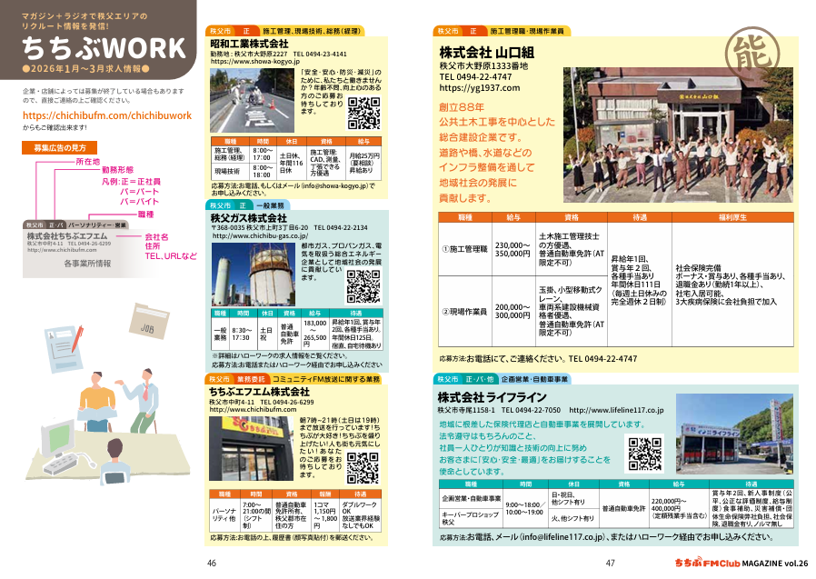 リクルート情報発信中!「ちちぶWORK」 2026.02.06 お知らせ 2025年10月から、秩父地域のリクルート情報を発信しております。ちちぶエフエムが発行している「ちちぶFMClubマガジン」とラジオとWEBでリクルート情報を発信しております。▷リクルート情報はこちら!▷リクルート情報を発信したい事業者様募集中。誌面だけでなく、ラジオやホームページで求人情報を発信しませんか?詳しい料金体系は、こちら!